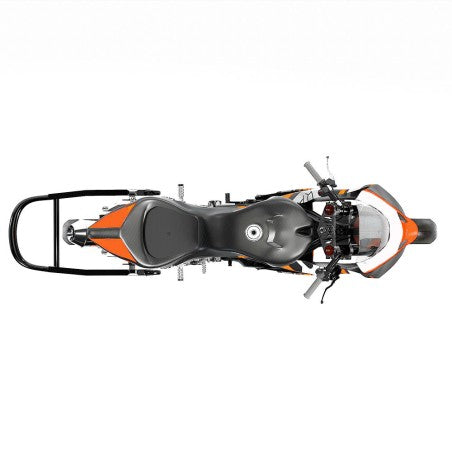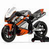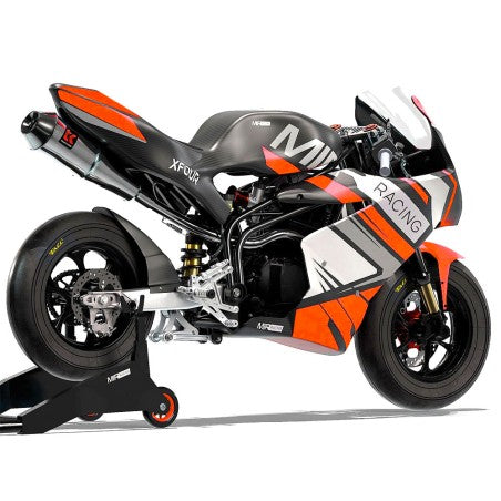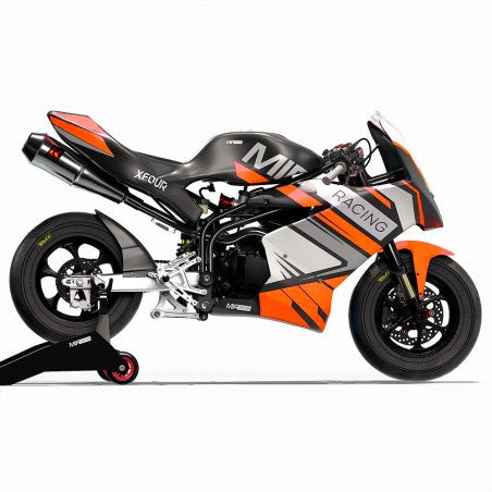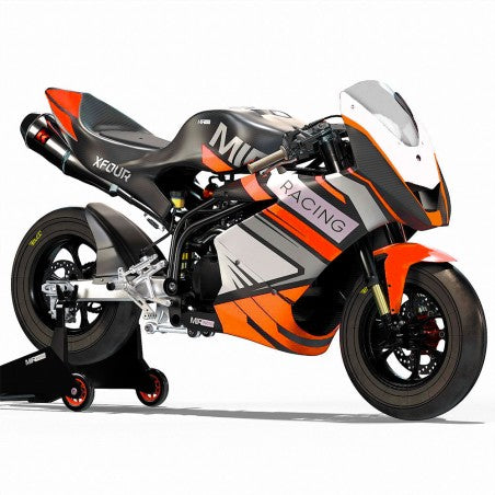 La MIR Racing GP12 220cc destaca por su versatilidad técnica y su robustez. Su corazón es un motor de 223cc con cambio manual de 5 velocidades, montado sobre un avanzado chasis multitubular de acero cromo-molibdeno compatible con motores verticales y horizontales. Esta estructura, junto a su basculante de aluminio CNC con regulación de pívot independiente, permite un ajuste milimétrico de la geometría de la moto.