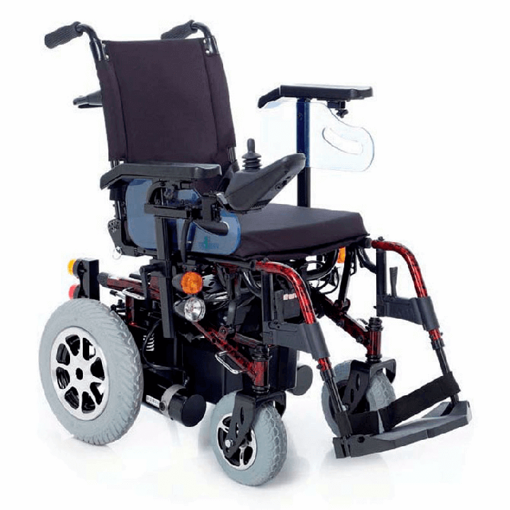 La silla está equipada con suspensiones en las ruedas traseras y ruedas antivuelco, ofreciendo seguridad y comodidad incluso en terrenos irregulares. El mando de conducción incluye joystick desplazable y existe opción de mando de acompañante. Las luces delanteras y traseras garantizan visibilidad y seguridad.