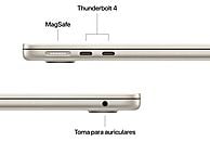 Conectividad de Vanguardia La conectividad es de alta velocidad: Wi-Fi 6E (802.11ax) y Bluetooth 5.3. Dispone de 2 puertos Thunderbolt/USB 4 (40 Gb/s) para transferencias ultrarrápidas y conexión a monitores externos (DisplayPort), además de la carga dedicada a través del puerto MagSafe 3.
