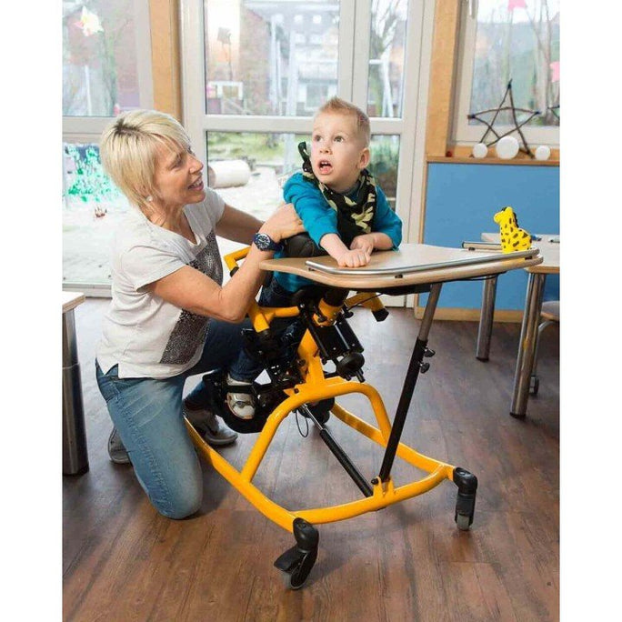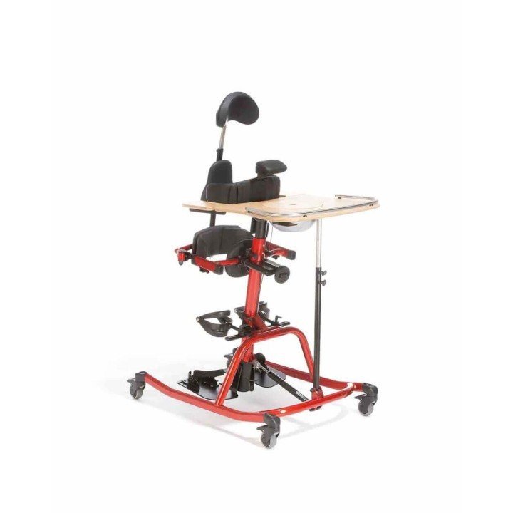 Equipamiento Completo: Incluye soportes de nalgas y pecho, además de una mesa terapéutica de madera que fomenta la realización de actividades durante la bipedestación.