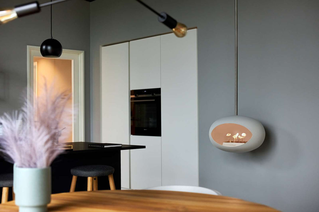 Diseño Esférico y Aspecto Flotante La silueta icónica, suave y semicircular de la cúpula, junto con su método de montaje elegante, crea la impresión de que la chimenea flota sin peso en la habitación. Es el punto focal perfecto para el salón, el comedor o un espacio comercial, sin ocupar espacio en el suelo.