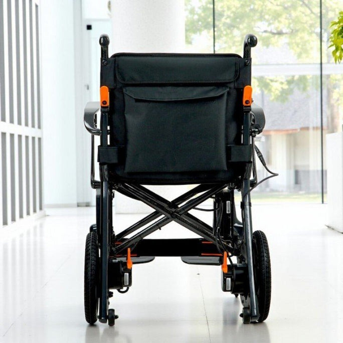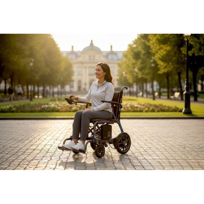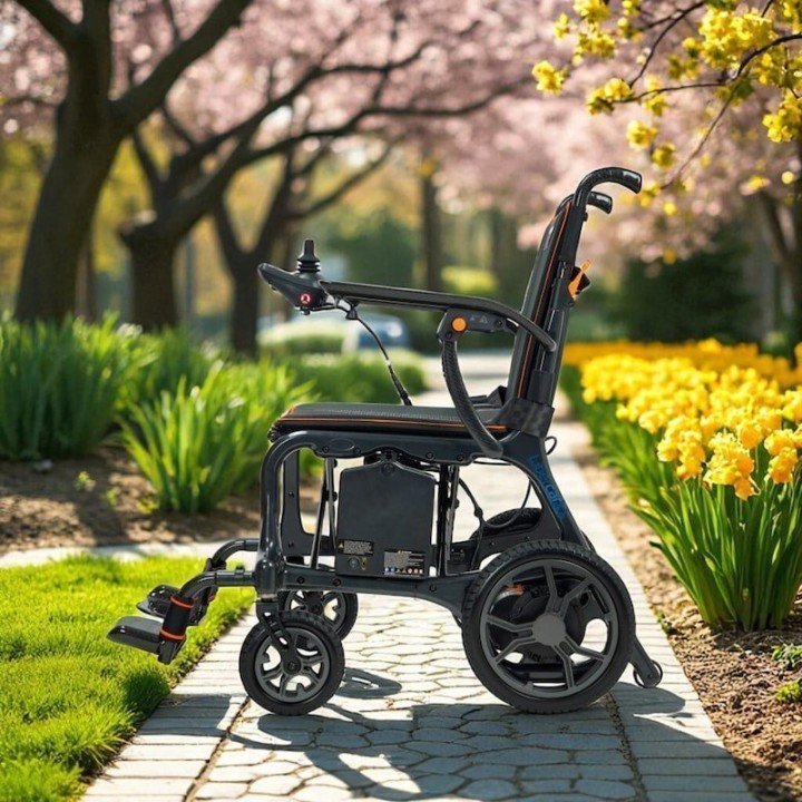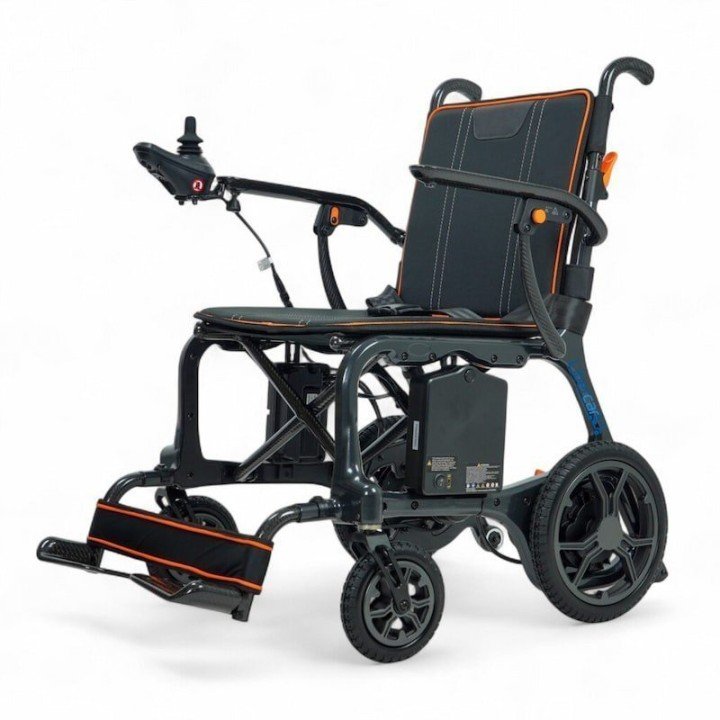 La practicidad es el sello distintivo de la Vera: cuenta con un sistema de carga doble (en la silla o extrayendo la batería) y una batería de litio que incorpora una toma USB para cargar dispositivos móviles. Su plegado es ultra compacto, alcanzando apenas los 24 cm de ancho, lo que permite guardarla en casi cualquier maletero. Además, sus reposabrazos abatibles y reposapiés extraíbles facilitan enormemente las transferencias laterales y el acceso frontal, garantizando una experiencia de uso cómoda, segura y sofisticada.