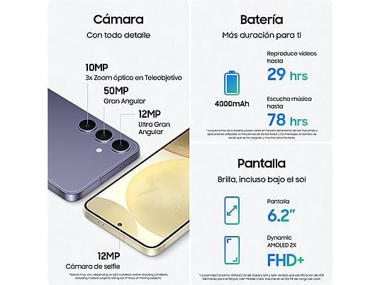 El Galaxy S24 incluye 256 GB de almacenamiento, 8 GB de RAM, conectividad 5G, WiFi 6e, Bluetooth 5.3, NFC y Dual SIM/eSIM. Su batería de 4000 mAh es compatible con carga rápida de 25 W y carga inalámbrica. Está protegido por certificación IP68 frente al agua y al polvo. Todo ello en un cuerpo ligero y compacto de tan solo 167 g.