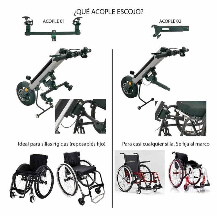 Acople 01: Diseñado específicamente para sillas de ruedas de chasis rígido. Este sistema permite poner y quitar la handbike con facilidad.3
